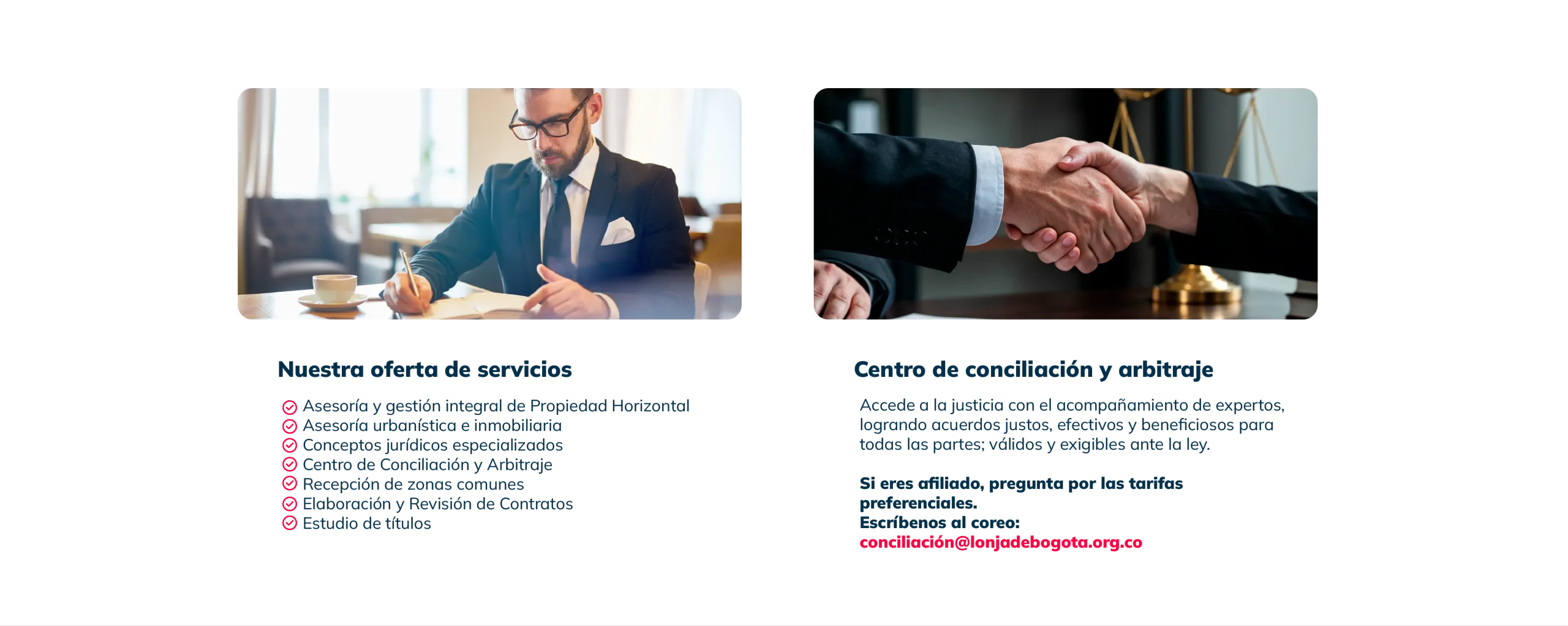 Brindamos asesoría integral y consultoría especializada en derecho inmobiliario, urbanístico y de la propiedad horizontal. Contamos con un centro de conciliación y arbitraje especíalizado en el sector inmobiliario.